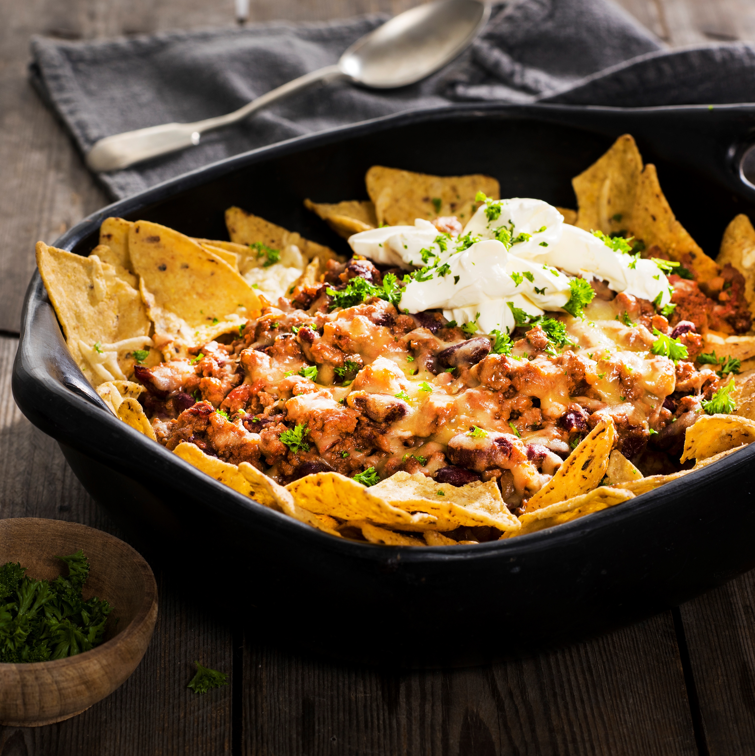 6. Serve with nacho corn chips, sour cream and grated cheese then sprinkle over the parsley.